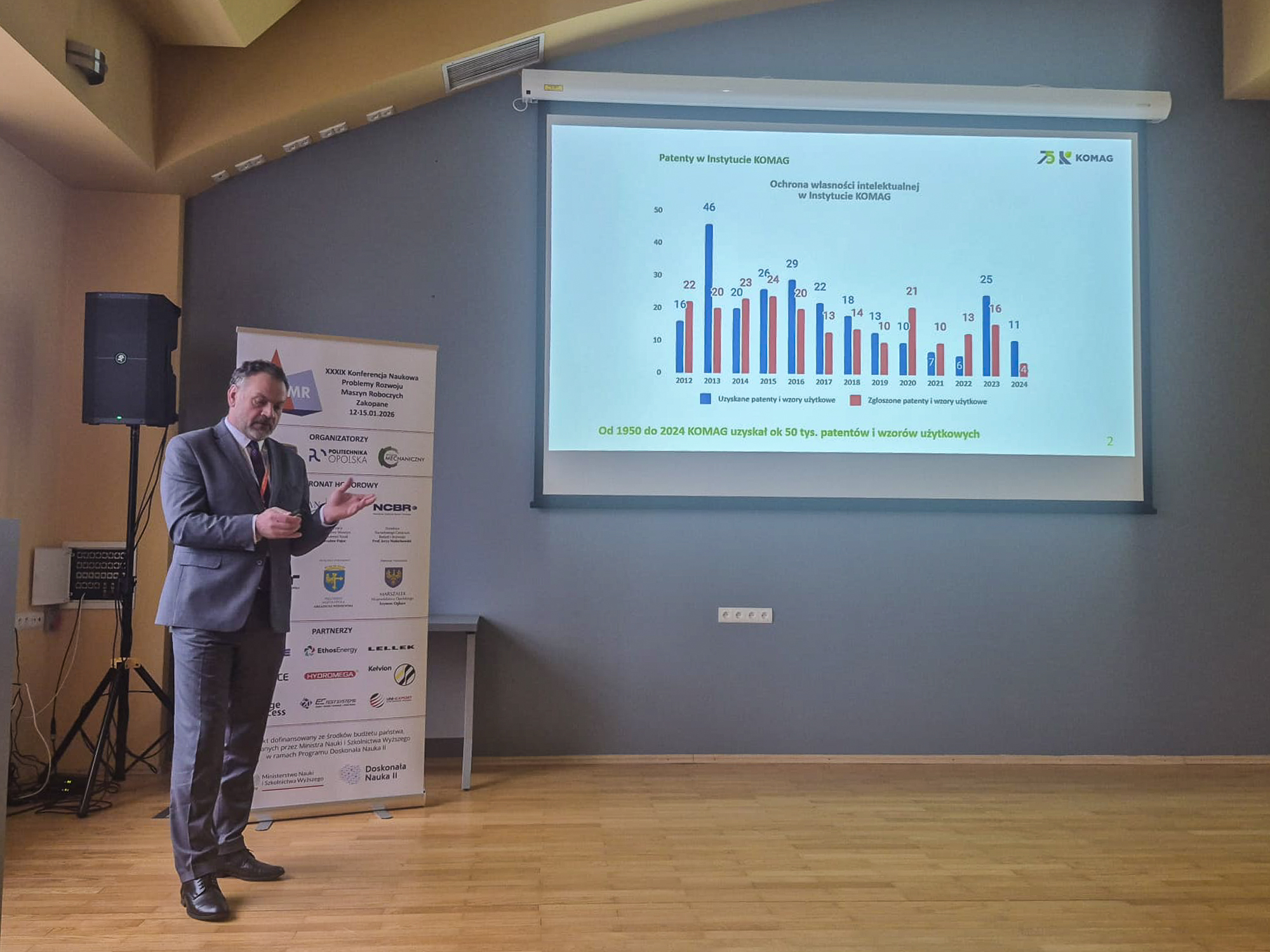 Podczas konferencji Problemy Rozwoju Maszyn Roboczych 2026 (PMRM 2026) odbywającej się w dniach 12-15 stycznia br. w Zakopanem referat wygłosił Dariusz Prostański, Dyrektor Instytut Techniki Górniczej KOMAG. Wystąpienie pt. „Wpływ innowacyjnej działalności wdrożeniowej na potencjał wynalazczy instytutu badawczego” dotyczyło roli działań wdrożeniowych w budowaniu zdolności innowacyjnych i wynalazczych instytutów badawczych oraz ich znaczenia dla skutecznego transferu wyników prac B+R do praktyki gospodarczej. Konferencja PMRM, organizowana cyklicznie od prawie 40 lat, stanowi jedno z kluczowych forów wymiany wiedzy pomiędzy środowiskiem naukowym i przemysłem, koncentrując się na zagadnieniach projektowania, badań, automatyzacji, diagnostyki i eksploatacji maszyn roboczych.